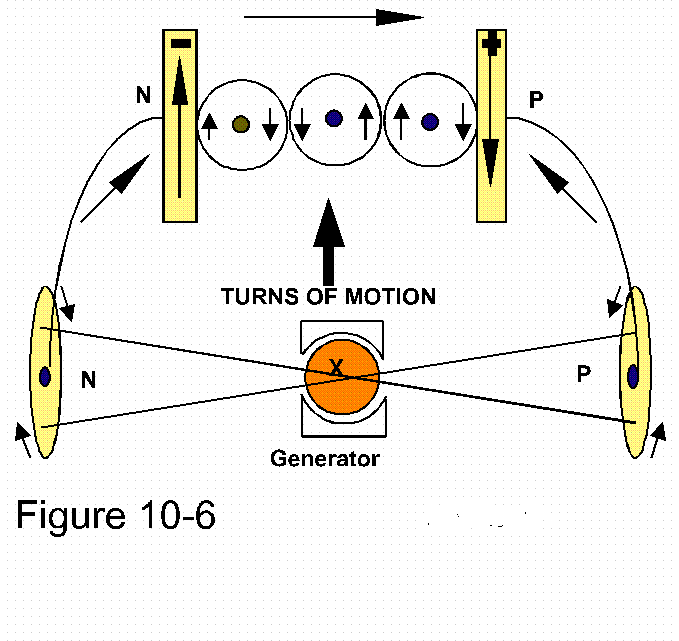 Reference figure 10-6; To utilize the power of electricity we generally tap from either end to the middle, or from the two ends in which the opposing movements of rotation may find their "turns of motion" in which to balance or appease themselves (figure 10-6).