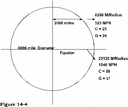 For simplicity let us view just two points on the face of the earth. By illustration figure 14-4, the 8,000 mile diameter of the earth at its equator computes to some 25,120 miles of circumference, which - in one turn for 24 hours - comes to a velocity of 1,046 miles per hour.