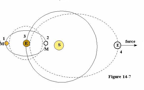Planets now do not always travel in a perfect circle around their vector, since their movement is influenced by other planets. Let us by figure 14-7, have the sun, moon, and earth in a line, with the earth at position 3, and the moon at position 2.