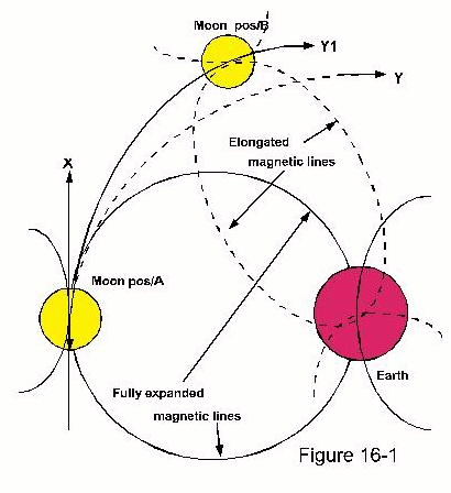 In other words, it has found equilibrium; the optimum of the strain verses its own inertia. This strain then re-shapes the magnetic lines of force elongating them, as illustrated by the broken lines (Figure 16-1), moon at position B). Here then is where the tides come in.