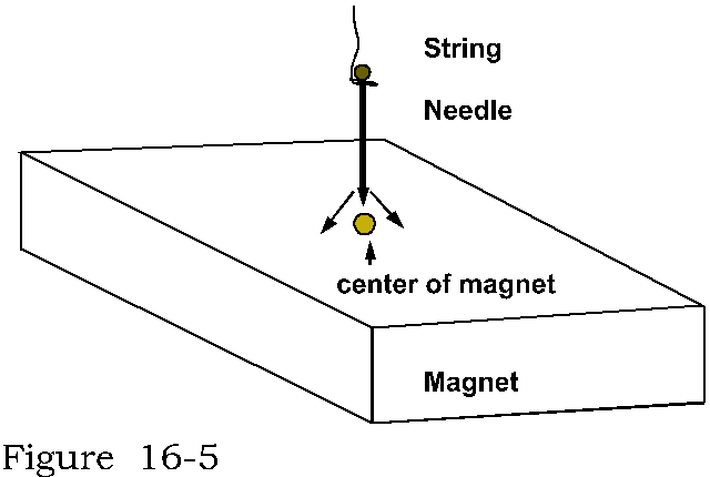 If we care to make our own demonstration to this effect, take a magnet and mark the dead center thereof as shown by illustration figure 16-5 Then stroke a needle over the magnet so it may be magnetized. Suspend the needle on a thread, and with unlike polarities facing each other (north to south or south to north) attempt to have the needle draw itself to the center of that magnet, which in effect is its magnetic north.