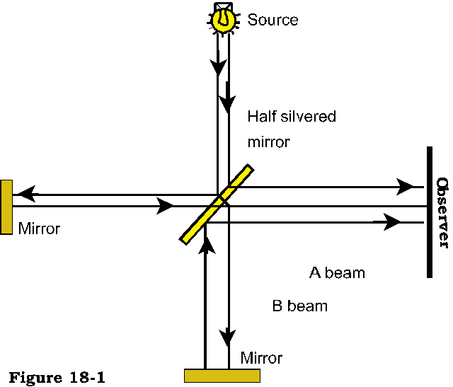 Reference figure 18-1. A device to confirm this was originally made by Michelson and Morley. It featured a light source passing through a half-silvered mirror - part of it being reflected and part of it passing through, thus accounting for two separate beams.