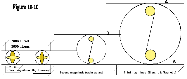 By illustration figure 18-10 each magnitude of nature has its own dimension. Magnetic force and electrical current are founded in the "overall" or third magnitude of nature, the tubular width of these waves corresponding to that same dimension which is essentially along component factors.