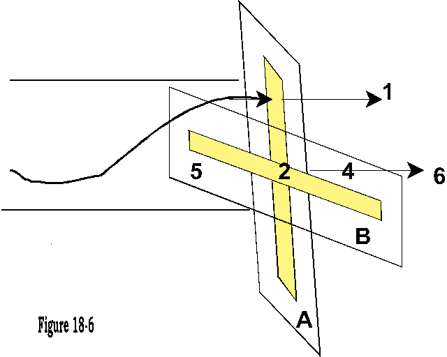 Transverse waves are not the only ones that can pass through narrow slots. If we take the tubular width of a line of light and place two plates over it with a narrow slot each, one vertical, one horizontal (Figure 18-6, and 18-7), it will leave one small square (2) by which the train of the wave may pass. If the plates were centered on the wave's tubular width, no light would pass by points 1 through 6 blocking the train.