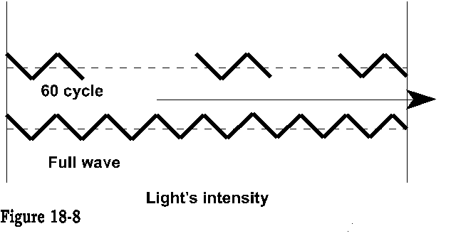 A 60 cycle current used to produce light in our homes, is a light source that is cut off and on at 60 times per second, a revolution of 3600 rpm. The way we receive light therefore in our homes is intermittent as illustrated by figure 18-8 top line.