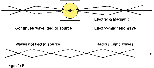 As per illustration figure 18-9, a continues wave formation is extended from the generator, which applies to magnetic cores as well. The instant that the generator stops, or the core of a magnet is removed, so are the waves, or the lines of force which cease to be.