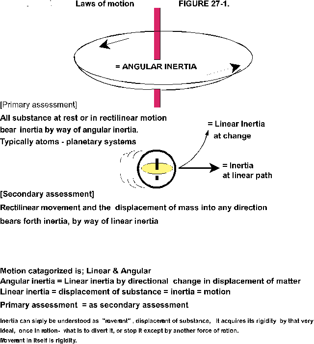 As then force is motion, motion comes in two directions of, and inertia being motion, it comes in these by the terms of linear and angular. All substance then being made up of atoms, and atoms being systems of parts in motion, it accordingly is defined as having a momentum of angular force or inertia. [Reference illustration figure 27-1).
