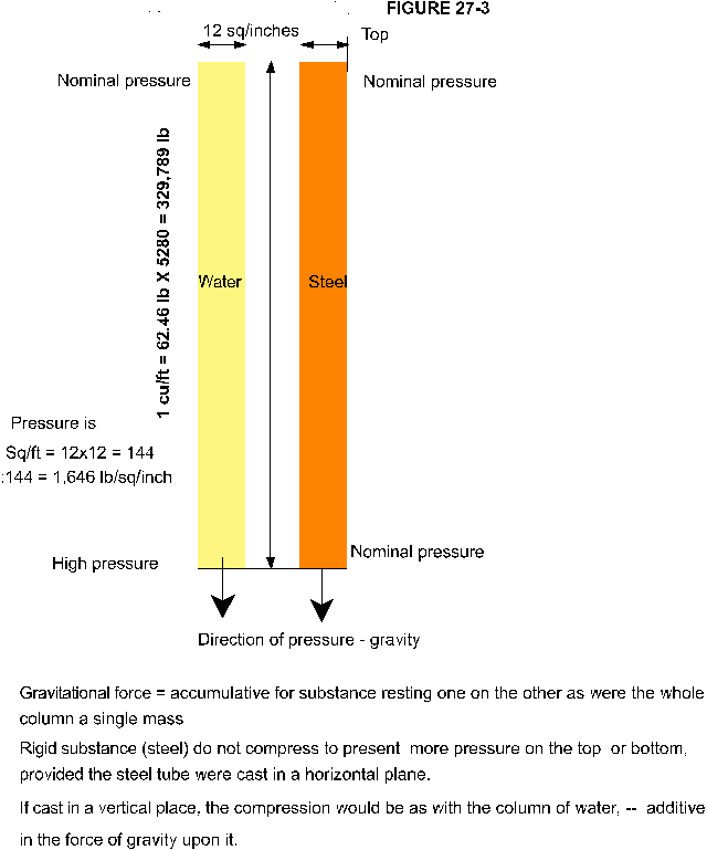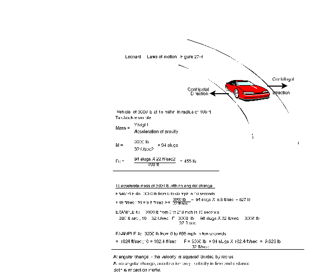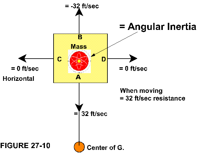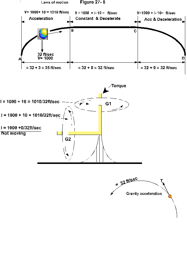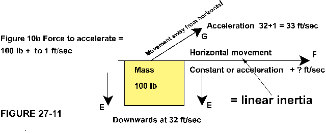 Once more, by figure 27-11, assume the mass of 100-lb in motion direction F, at a constant horizontal velocity that is even greater than the acceleration of gravity which at 32-ft/sec is holding the mass downwards direction E. The mass will not come off the ground since there is no acceleration above the 32-ft/sec in a direction away from the direction of gravity.