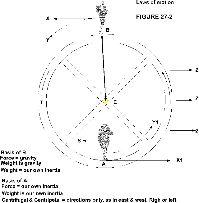 Next, let us from a rest (idle) position of the ring cause it to rotate as indicated. The lady at point A would then begin to feel weight (direction Y1), as if a force of gravity pushed or pulled her down. We said “as if gravity” - knowing there is no gravity, thus we conclude it must be a force of centrifugal that she feels.