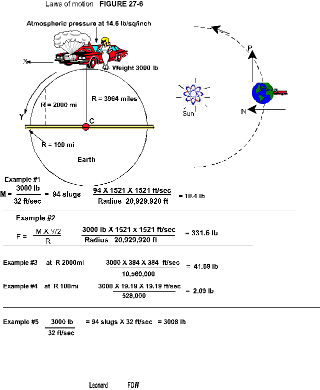 Taken the example (Figure 27-6) of a 3000-lb vehicle at the equator, the weight multiplied by the velocity of 1521-ft/sec, and squared, then divided by the radius leaves us with a resistance of 331.6-lb into the centrifugal direction. And since 3000-lb divided by 32.14 is 93.34-slugs multiplied by 32.14-ft/sec is 3000-lb.