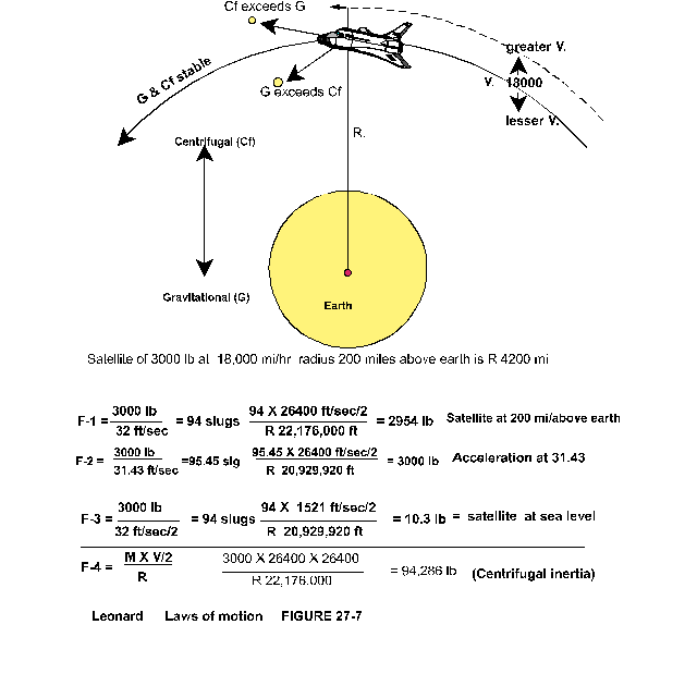 And for the next example, our satellite at 200-miles above the earth (Figure 27-7) having a gravitational weight of 3000-lb (minus 2% in acceleration of gravity) has an inertial resistance into the centrifugal direction of 94,286-lb - within which the -3000-lb is exceeded.