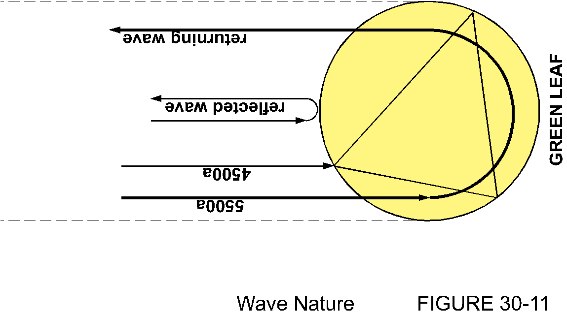 Thus there is a difference illustrated by Figure 30-11, the circle being an atom or molecule of a green leaf on a tree. If then the light is reflected from it, the wavelengths did not enter the molecule, and we would not see the green of the leaf, but rather a haze, or a glare.