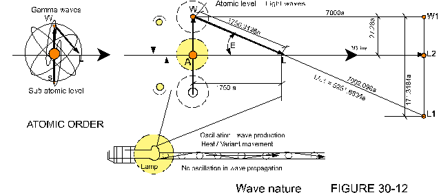 These fundamentals are the same for both the atomic and the molecular order, in all four of the levels thereof illustrated by figures 30-12 & 13 The inset in figure 30-12, in size, is thus but a millionth of a cm on the wire in the incandescent lamp shown below it.