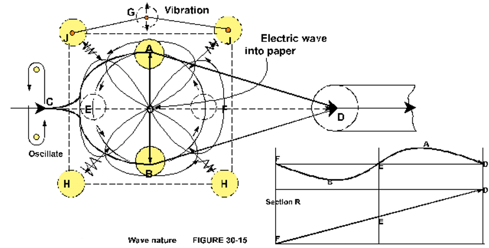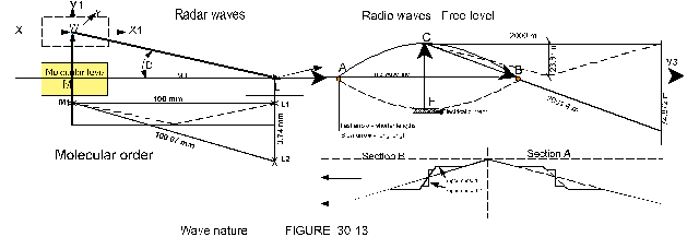 On the order of radar waves, the oscillation (atomic movement), is replaced with (simply said) a dent-maker, where an electrical current is used to resonate, or string a magnetic line, creating a variant by an on/off, or reverse switching in movements of directions (polarities) (Figure 30-13 / MWL)