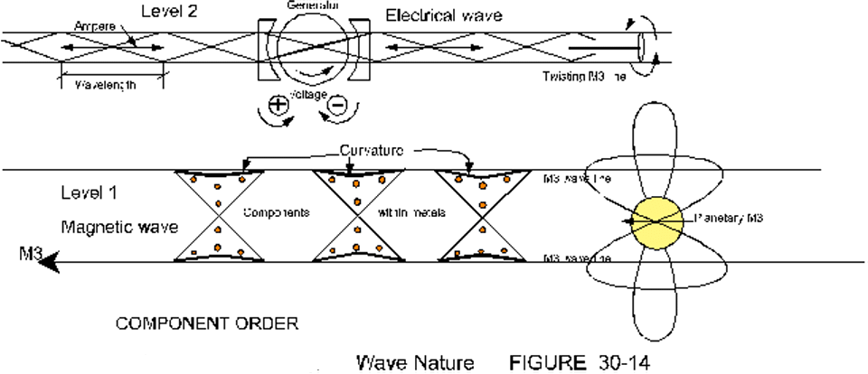 This in principle describes the two orders in the four levels thereof. And to clarify one more item: If a force, spike, modulation, oscillation, or whatever, is from M to W, figure 30-13, and it were a particle, or if light were particles, the result would be a movement into direction M1.