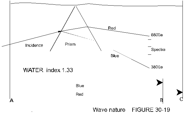 There is for example by figure 30-19, this omission, in a spectrogram where if we read the shift from a prism that is set in water and converted it into velocity by a comparison for air, it would show the shorter blue waves to have a reduction in velocity equal to the longer red waves.