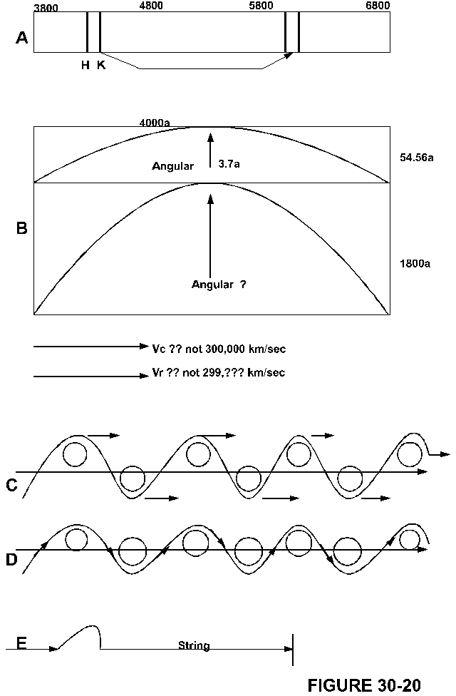 By figure 30-20, section A, how do the spectral lines of H and K come to some 1800a removed when for the 3.7a greater length in identity (section B) there can be no more than 54.56a readable shift? If we placed 1800a into the angular then either Vc or Vr are in error.