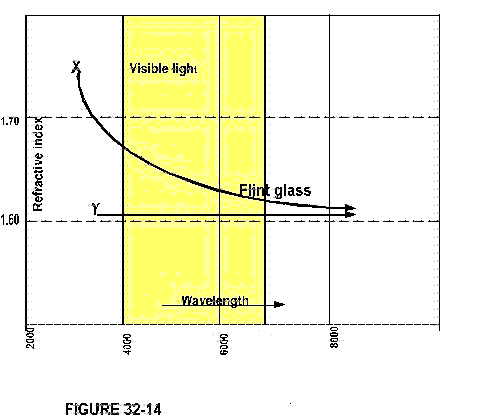 By figure 32-14 the curve X for the index of refraction of flint glass is incorrect, it should be line Y, the index of refraction being the same for all these wavelength. This small notation is of prime importance, since that curve destroys the spectra, and the whole ideal in wave-shift.