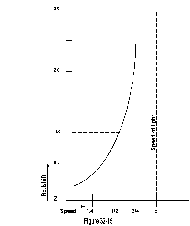 red-shift (z) is the fractional shift in wavelength, as measured on a spectroscopic plate. For example, if all of the wavelengths of the spectral lines of a galaxy are lengthened by 25%, then z = 0.25. This graph shows the relationship between z and speed. The highest possible speed is c, the speed of light.”