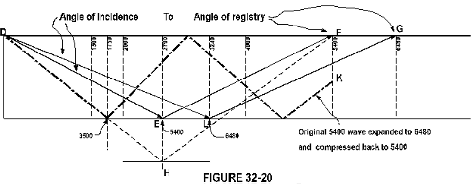 by figure 32-20 let us take a 5400 angstrom wave the normal position is DEF, and expand it by 20 percent to a length of 6480 angstroms maintaining a fixed circumference since we are still below the 25 percent mark.