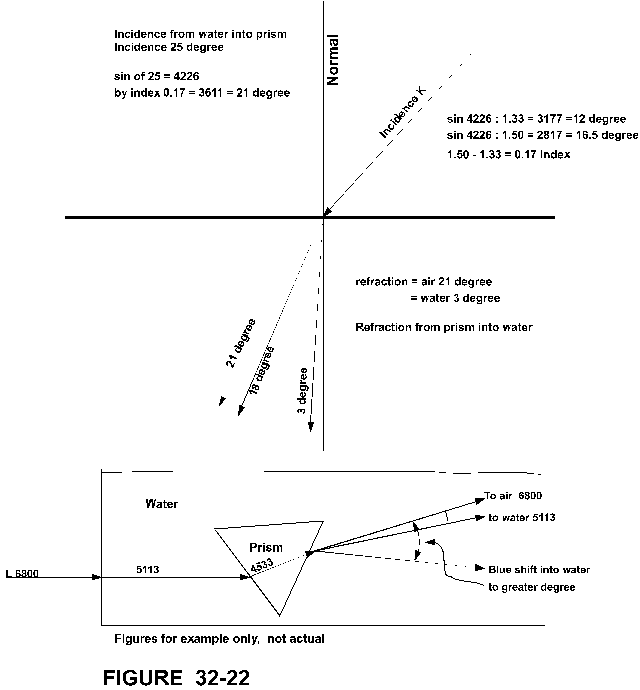 If we consider an incidence such as K by figure 32-22 at 25 degrees to normal, the sine for 25 is 4226 by an index of 1.33 for water would be 12 degrees, and for glass by 1.50 at 16.5 degrees.