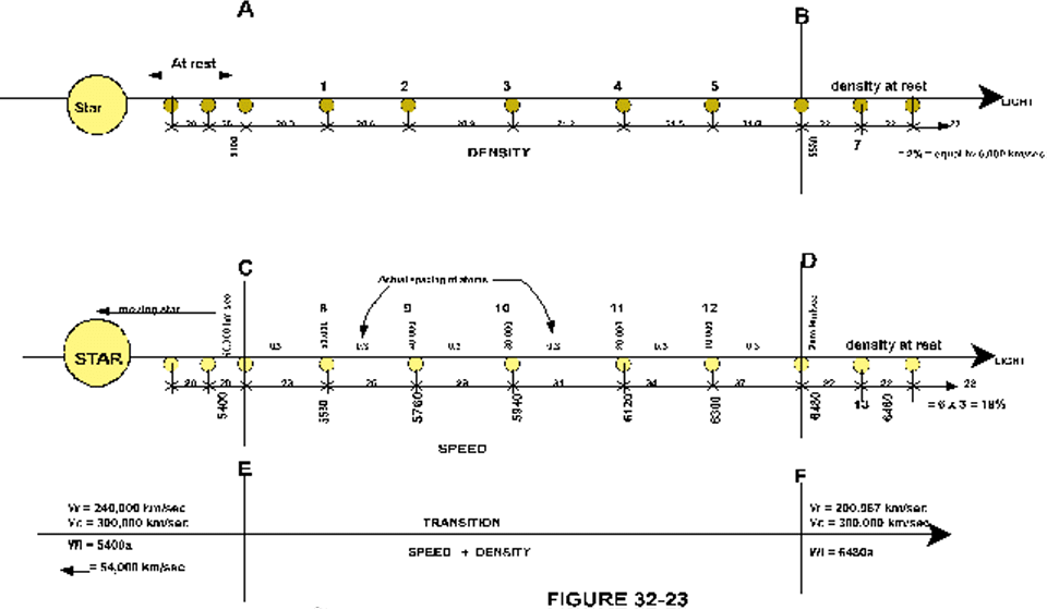 By figure 32-23 let us debate shift into velocity, or velocity into shift. Assume the media on the right of point B at rest, with the density of its part at a given measure of 22. And on the left of A we have a star at rest with the density of the media surrounding the star and wherein the light passing AB was formed at a measure of 20.