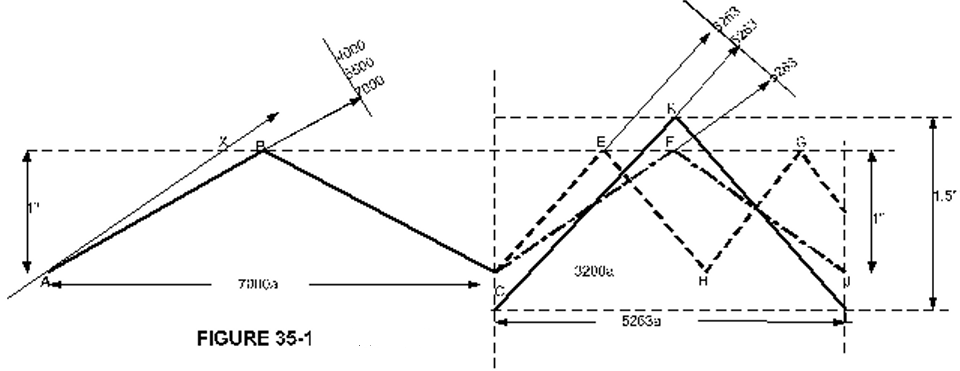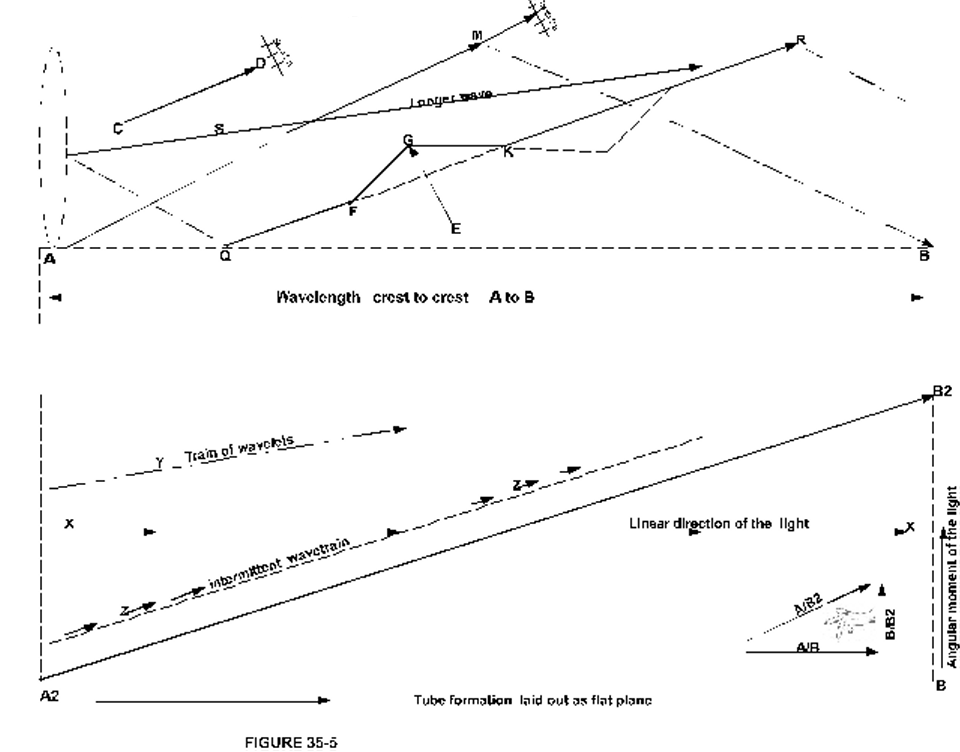 As therefore different measures will place different angles it would enhance us to know the real diameter. Figure 35-2, depicts the 7000a wave at a diameter of 1000a. But I believe this diameter to be less, small enough that if scaled upon our 8-1/2 x 11 sheet it would appear more like a straight line.