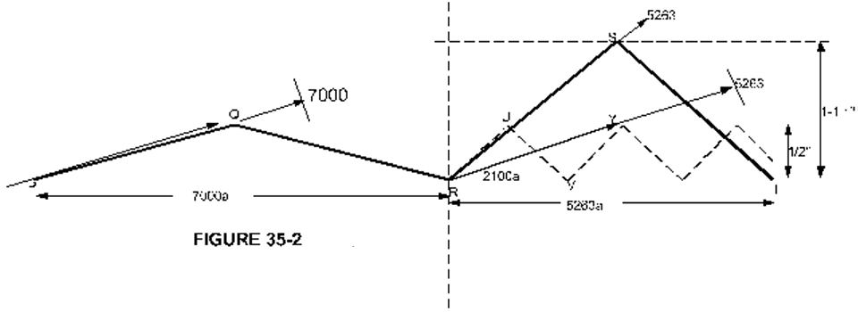 We can do the same thing by a different set of measures, to reduce the diameter by one half in figure 35-2. In which case the retarded diameter did not increase by only fifty percent as before, but more than doubled from one half inch to one and one quarter inch. And to place R-S-T into the one half inch diameter it becomes R-U-V-etc. reducing the crest to crest measure down to somewhere near 2100a.