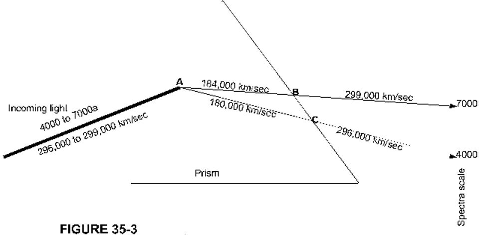 The next item is the spectra, our reading of the angle of the wave by which length is determined, and by which shifts to the red or blue may be seen. How for example can we (Figure 35-3) determine the individual lengths of the waves of the incoming light that strikes the prism all at once together?