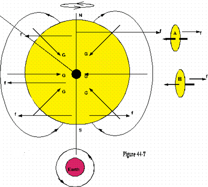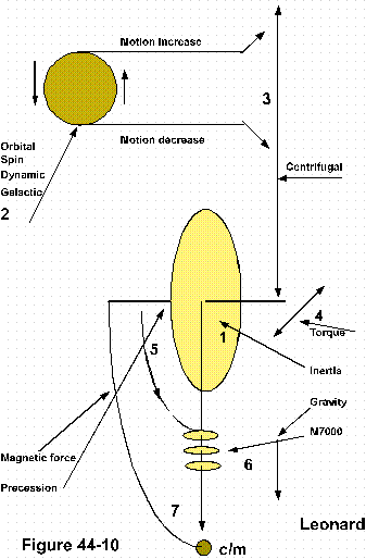 By illustration, angular momentum as "inertia" comes first, and it is the "key" factor (Figure 44-8- #-1). Let us then assume this inertia to be in a state of rest, fixed in the space in which it resides, which in all reality is not to be found, all things in the universe being in motion.