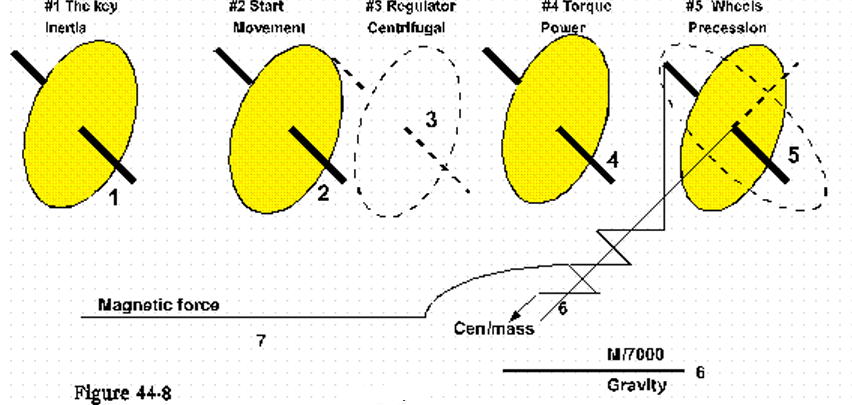 Factor number 5 may be called the "wheels" of the vehicle, which is the movement of precession brought about by torque upon angular momentum. (Figure 44-8- #5).
