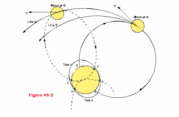 But to do this once again; with first placing the moon at a rest position A, (Figure 45-2) there would be no tidal bulges - since the lines of force between the two bodies are at what we might call equilibrium.