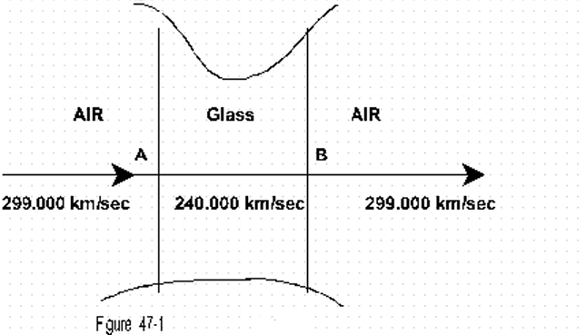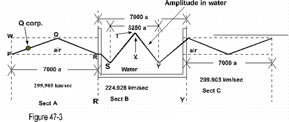 By figure 47-3, from point P to R the light - if it traveled on a straight line without wave-like formation - it would pass at a velocity of 300.000 km/see, (constant .V3, or c).