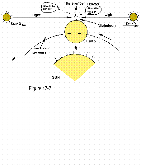 Michelson had hoped to read a variation in the speed of the light of the two stars, instead he read the velocity of the light of both stars to be identical. Neither one showed the 1000 km/sec velocity in which he was moving with the earth. (Earth's velocity.)