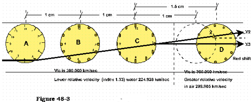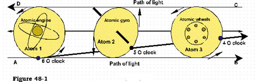 This may be further illustrated by figure 48-3, the atoms within the media of the same density are effectively spaced by equal distances. As therefore the wave coordinate moves itself around the clock (in our example passing from 5 O’clock at atom A, to 4 O’clock in Atom B, and to 3 O’clock in Atom C), it is to make contact upon 2 O’clock in atom D.