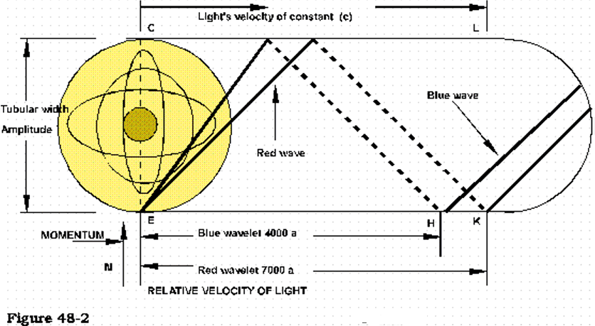 What then shall the velocity of these waves be - as they are taken away by the "constant?" The blue wave makes a full turn around the tubular perimeter at every 4000 Angstroms E-H, wherefore its speed will be less than the constant