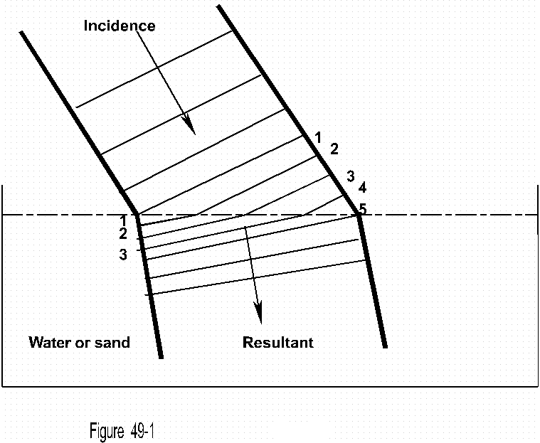 Huygens principle of refraction is the classical example of a row of men walking obliquely into a bed of sand (Figure 49-1) The first to enter upon the bed of sand are slowed while the remainder continues until they come upon the sand, which effects the turn.