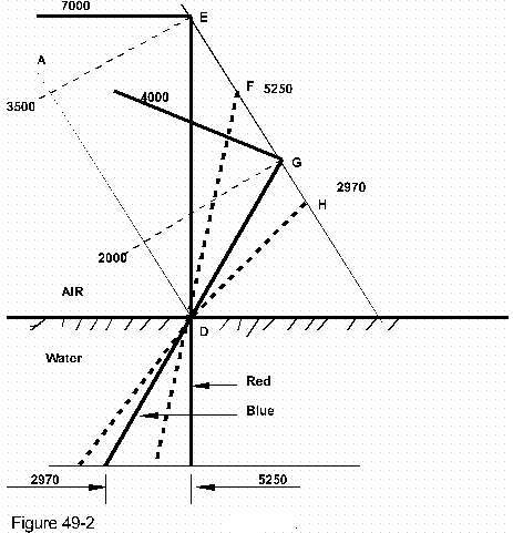 The comparative wave angles for the red at 7000a, and for the blue at 4000a, are ED and GD respectively. The index of water then being 1.33, the red wave will be compressed to have a new crest to crest measure of 5250a, while the length for blue light is reduced to 2970a.
