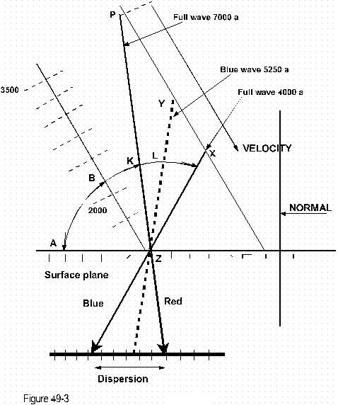 (Figure 49-2) The dispersion of the light thus is not in a change of velocity, nor in any varied velocity whereby these wavelengths might travel through the denser medium, but in incidence, specifically, "waveform" incidence.