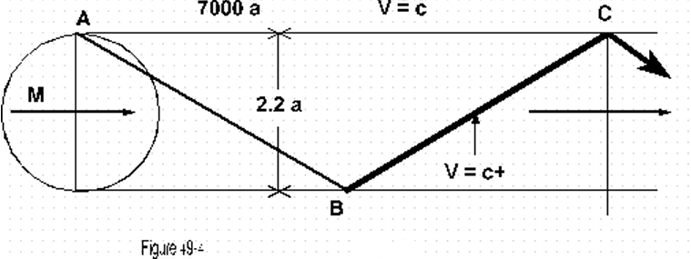 By illustration figure 49-4, "M" represents the momentum. From point A to point C the light will travel at a given velocity which we must measure or calculate from the three components length, amplitude, and frequency.