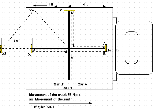 Let us therefore assimilate the earth by a truck having a flat bed on which to carry the interfero-meter and proceed with our experiment. In order to simulate the movement of the earth figure 53-1 the truck is set in motion at 55 MPH.