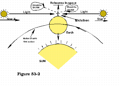 And so the diametrically opposite star experiment (Figure 53-2) was made by Mr. Michelson to record the velocity of the light from the two stars A, and B. This to his surprise was found to be the same for both stars, near to 300.000 km/sec.