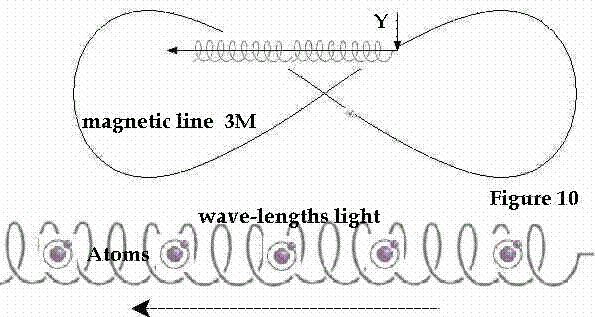 But then again we must not be deceived in thinking that this spinning line of magnetic force known as light is able to travel on its own. No quite the contrary, it remains by what gave it birth, it spirals around all the perimeters of the atoms in its linear path (as demonstrated by figure 10). Never once therefore will it enter into the interior of any atom, lest it be grounded to a halt.