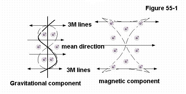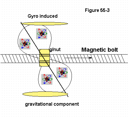Figure 55-3 then is to illustrate the gravitational component when it is "out of the normal", so known when there is a torque upon its angular inertia. And as mentioned before this may very well be likened to a nut in precessional rotation bearing down upon the magnetic lines of movement.