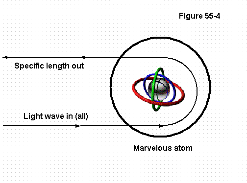 Just consider how sunlight enters upon the green leaf of a tree in all lengths thereof, and coming upon the atoms and molecules of their compound form, all but the green wavelengths are as we may say "arrested", the green lengths alone leave it to come into our eyesight. (Figure 55-4 serves to project some illustration)