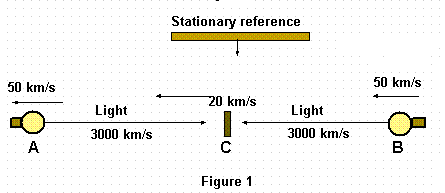 By the illustration let us assume two lights at A and B and that they are in motion to the left at 50km/sec. This is in reference to a stationary point of reference as indicated at the top of the illustration. Then there is point C at which we are located with our device to read velocity and spectral shift. And we are moving at 20 km/sec in reference to the stationary vector.