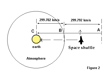 Is it not correct that to him this is in fact the speed at which the light of necessity must be passing him? This of course as we know is the mathematically deduced velocity while the light with us in the space shuttle never for real went any faster but remained at its velocity of 299.792 km/sec.
