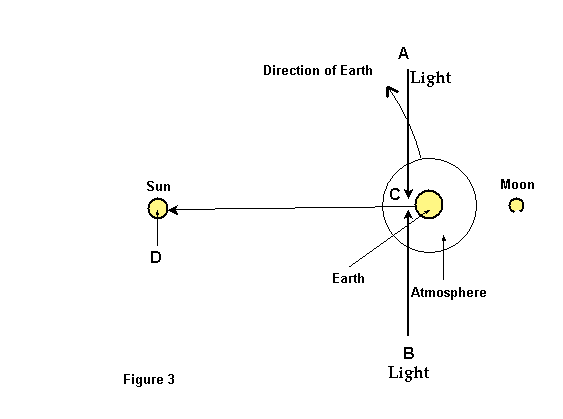 Then by illustration figure 3 let us take our Sun for a fixed reference. Here the earth is moving at 15 km/sec at a uniform circular movement into the direction indicated. We are at point C within the atmosphere of the Earth that moves along at the same 15 km/sec.