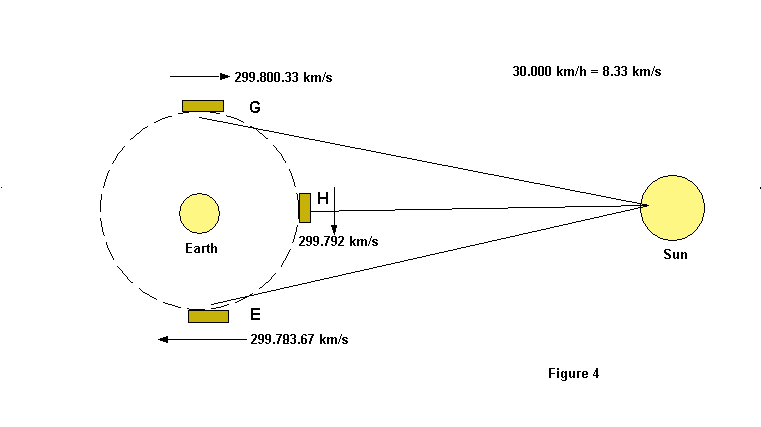 This of course is simple logic as well as common knowledge. The very same thing is observed on other stars and planets, or moons. At "G" our speed imputes a blue spectral shift, with no shift at "H" and a red spectral shift at "E" to the tune of our velocity in orbit.