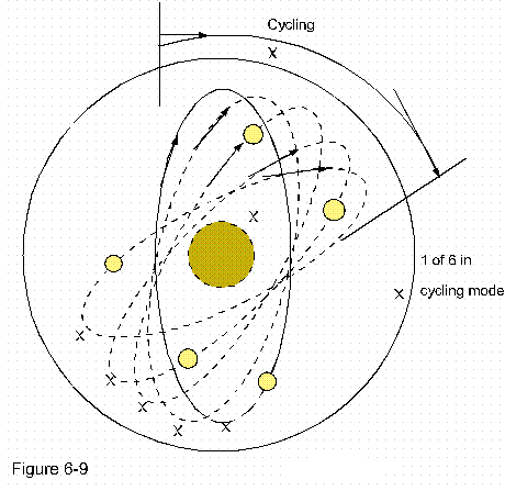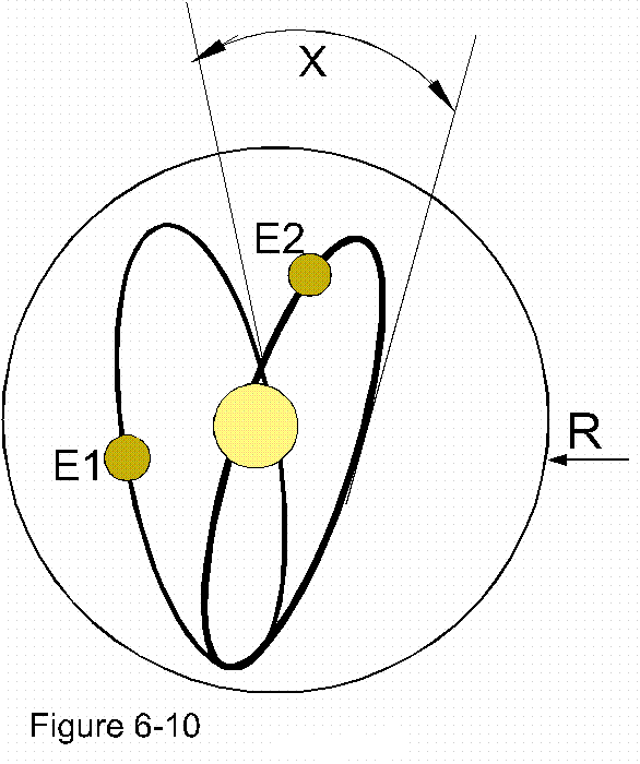 I then noted "cycling" as one such factor, and to give an example: by illustration figure 6-10, let there be a nucleus with an electron (e) whose constant orbit at radius (r), and let this electron cycle with an angular regularity of (x). Then adding a second at a separation for another value by which they are not only relative to one another but also to the whole.